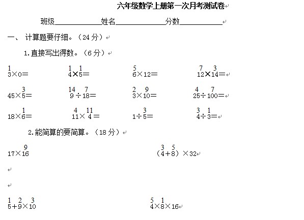 小学数学:第一次月考测试卷( 人教新课标版六年级上)(无答案)