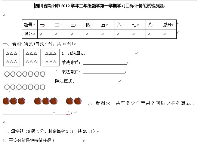 四川省简阳市2012学年二年级上学期学习目标评价笔试检测题(数学)无答案