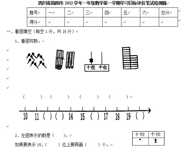 四川省简阳市2012学年一年级上学期学习目标评价笔试检测题(数学)无答案