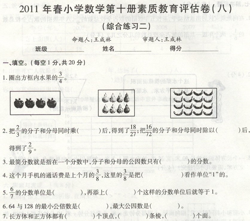 重庆市云阳县2011年春小学数学第十册素质教育评估卷(八)(数学)扫描版无答案 西师大版