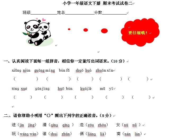 人教新课标 小学一年级语文下册 期末考试试卷二(语文)无答案